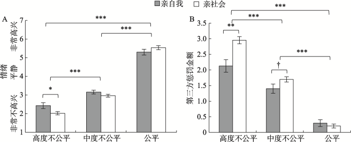 第三方惩罚任务与情绪测量 采用由独裁者博弈改编的第三方惩罚实验范式, 其中一方为分配者, 另一方为接受者, 被试为第三方旁观者, 并且在实验任务中测量被试的情绪。操作顺序: 告知被试“这里有10枚金币”; 依次呈现分配提议“分配者9/ 7/ 5枚金币, 接受者1/ 3/ 5枚金币”; 参考Gummerum等人(2020), 在7点量表上测量被试看到该分配提议时的情绪效价(从1到7为从“非常不高兴”到“非常高兴”, 4为“平静”); 告知被试“现在你有5枚金币, 这些金币你可以选择全部自己留下, 也可以选择拿出一部分来惩罚分配者”。该惩罚力度定为1∶2, 即被试每拿出1枚金币来惩罚, 分配者就会相应地减少2枚金币(Gummerum & Chu, 2014)。被试明白这一机制后决定拿出多少金币来惩罚分配者。惩罚额度是从0到5的任意整数。三种分配按顺序向所有被试呈现1次, 即高度不公平、中度不公平和公平分配, 被试在分配呈现后需分别报告其情绪与惩罚额度。