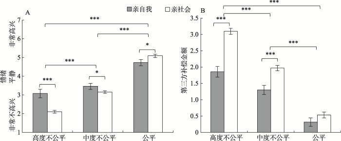 采用2 (社会价值取向: 亲社会, 亲自我) × 3 (分配公平性: 高度不公平, 中度不公平, 公平)的混合实验设计。主要因变量为被试的情绪与第三方补偿行为。