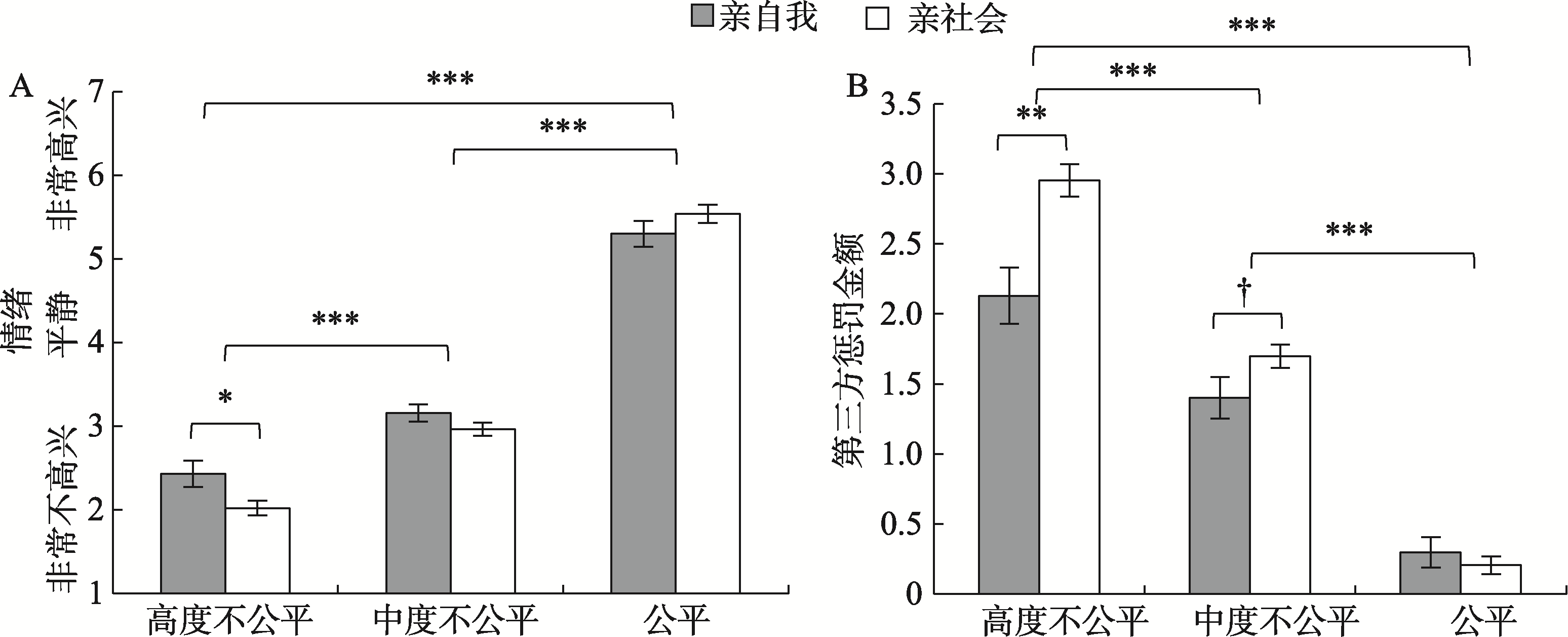| 图1 不同分配情境下亲自我与亲社会儿童的情绪(A)与第三方惩罚金额(B) 注: 图中的误差棒(error bar)表示标准误; † p < 0.1, *p < 0.05, **p < 0.01, ***p < 0.001, 下同 |