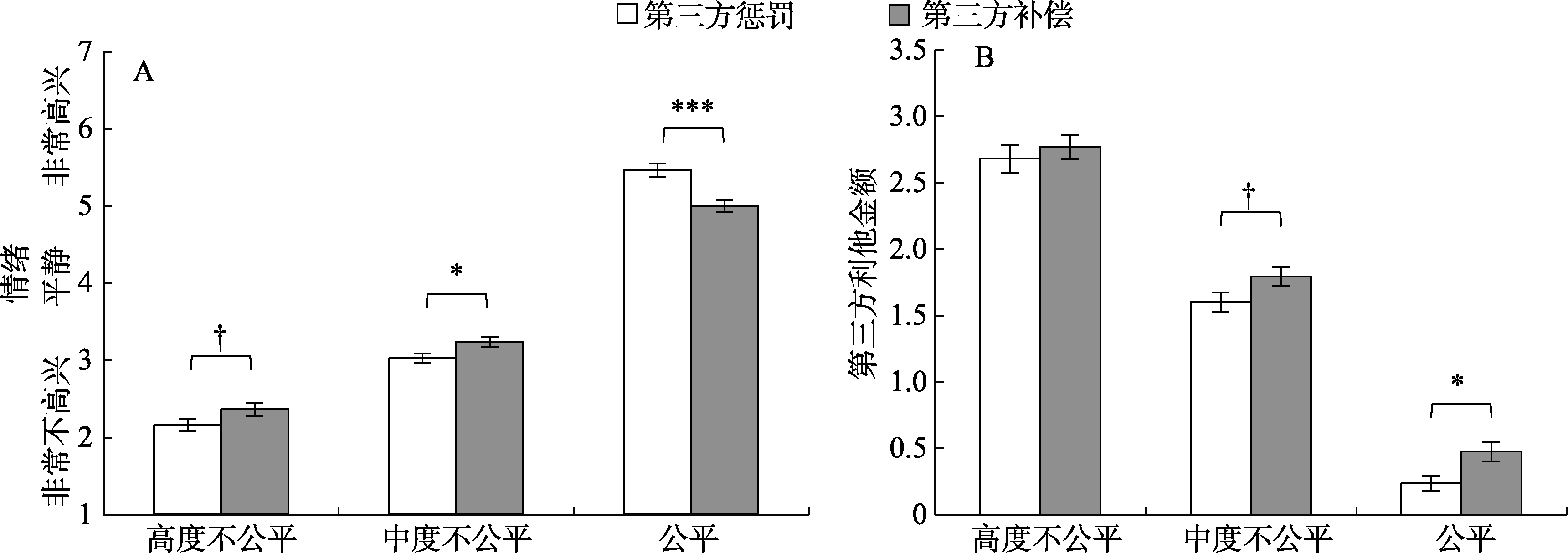 | 图5 第三方惩罚与补偿情境下儿童的情绪(A)与第三方利他金额(B) |