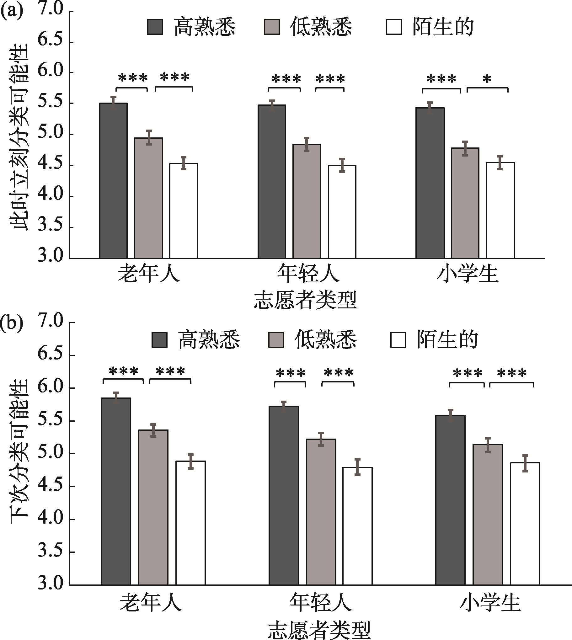(a)此时立刻和(b)下次分类情境下被试面对不同类型志愿者的合作意愿
