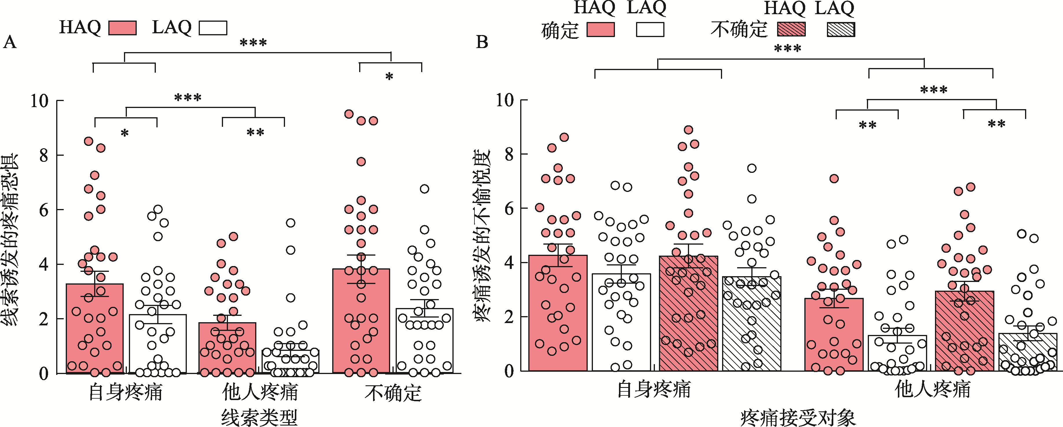 | 图2 假双人疼痛共情任务中的行为学结果 注:LAQ:低自闭特质; HAQ:高自闭特质; * p < 0.05, ** p < 0.01, *** p < 0.001。 |