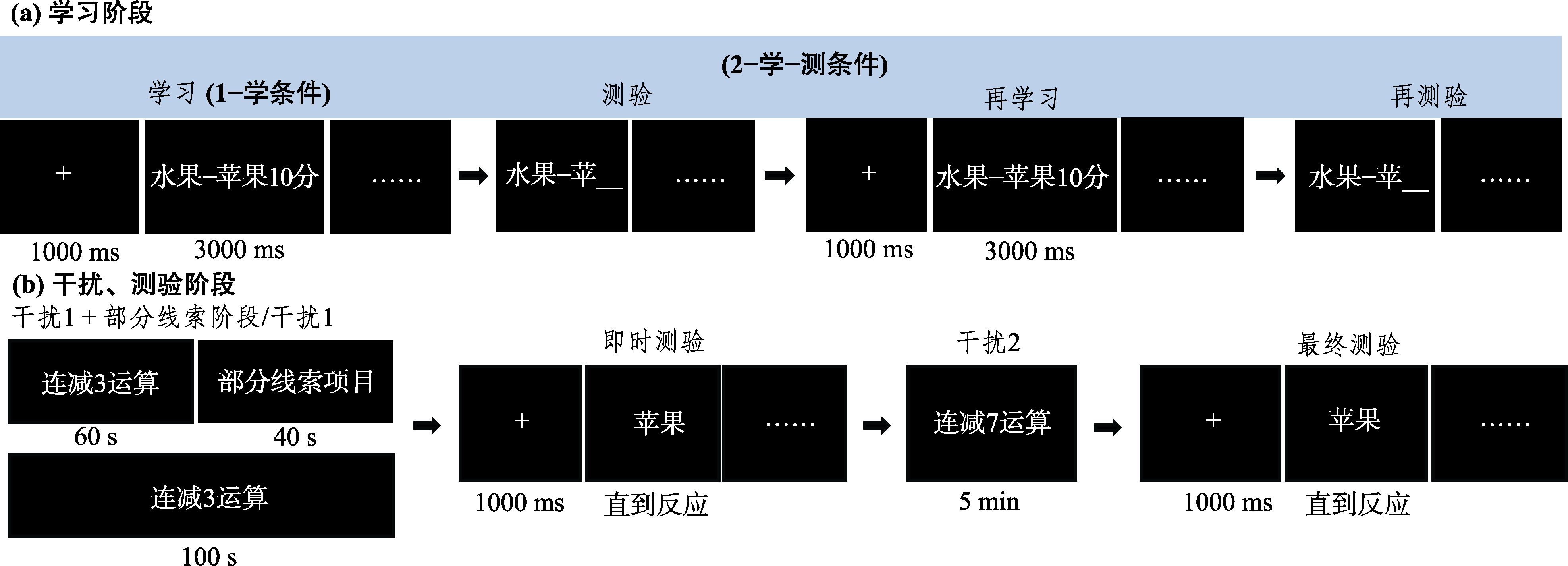 | 图3 实验2学习与测验阶段实验流程图。(a) 1−学和2−学−测两种编码条件下学习阶段的流程图; (b)有线索和无线索条件下干扰1、即时测验、干扰2和最终测验的流程图。 |