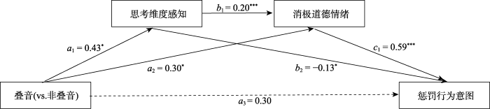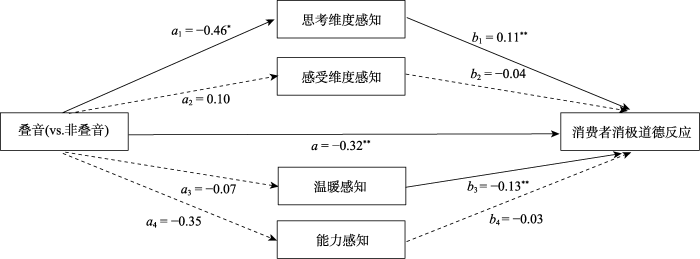 接下来, 我们采用对间接中介效应的自主抽样检验(PROCESS Model 4; Hayes, 2017)来验证思考感知在品牌作为道德主体发生品牌违规事件时, 叠音型品牌对消费者道德反应影响中所起的中介作用。以叠音与否(1 = 叠音, 0 = 非叠音)为自变量, 总体道德反应指数为因变量, 思考维度感知、感受维度感知、温暖感知、能力感知为并行中介变量的模型结果显示, 思考维度感知的间接效应(effect = −0.0513, SE = 0.0328, 95% CI [−0.1269, −0.0002])区间不包含0, 支持了思考维度感知所起的潜在机制作用。此外, 并行的中介效应检验模型还显示, 感受维度感知(95% CI [−0.0278, 0.0353])、温暖感知(95% CI [−0.0424, 0.067])与能力感知(95% CI [−0.0194, 0.0516])的区间都包含0, 结果说明了感受维度感知、温暖感知与能力感知的间接效应不显著。具体的中介路径系数见图1。