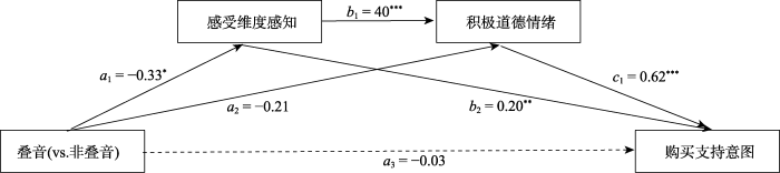 假设H2b: 在品牌作为道德受害者受害的情境下, 相较于非叠音品牌名称, 叠音使消费者感知到的品牌心智的感受维度更高, 从而增加了消费者对品牌的积极道德反应。