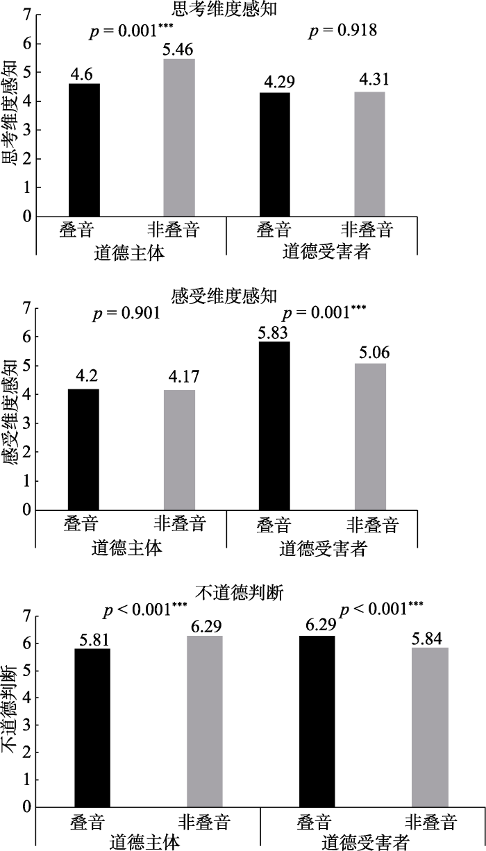 以品牌名称(1 = 叠音, 0 = 非叠音)为自变量, 消费者同情、消费者支持和品牌感受感知等其余变量为因变量的多元方差分析结果表明, 当品牌作为受害方出现时, 人们对于叠音品牌的同情(M叠音 = 5.93, SD = 0.93; M非叠音 = 5.51, SD = 1.25, F(1, 194) = 7.02, p = 0.009, η2p = 0.04)显著高于非叠音品牌。同时, 相比于非叠音品牌, 人们对于叠音品牌的支持也呈边际显著的趋势(M叠音 = 5.84, SD = 1.05; M非叠音 = 5.54, SD = 1.39, F(1, 194) = 4.62, p = 0.09, η2p = 0.01)。将这两个变量进行加总平均后形成总体道德反应的指数。结果显示, 总体上相比于非叠音组(M = 5.53, SD = 1.19), 叠音组的被试汇报了更高的积极道德反应(M = 5.88, SD = 0.89), F(1, 194) = 5.65, p = 0.018, η2p = 0.03。此外, 与非叠音品牌组相比, 叠音品牌组的被试也有更高的品牌心智的感受维度感知(M叠音 = 5.45, SD = 0.86; M非叠音 = 4.89, SD = 1.36, F(1, 194) = 12.23, p = 0.001, η2p = 0.06)与温暖感知(M叠音 = 5.62, SD = 0.87; M非叠音 = 5.33, SD = 1.08, F(1, 194) = 4.28, p = 0.040, η2p = 0.02)。但是, 品牌心智的思考维度感知(M叠音 = 5.10, SD = 1.28; M非叠音 = 5.28, SD = 1.21, F < 1, p = 0.338)与能力感知(M叠音 = 5.09, SD = 1.44; M非叠音 = 5.20, SD = 1.35, F < 1, p = 0.586)则在两组中没有显著性差别。