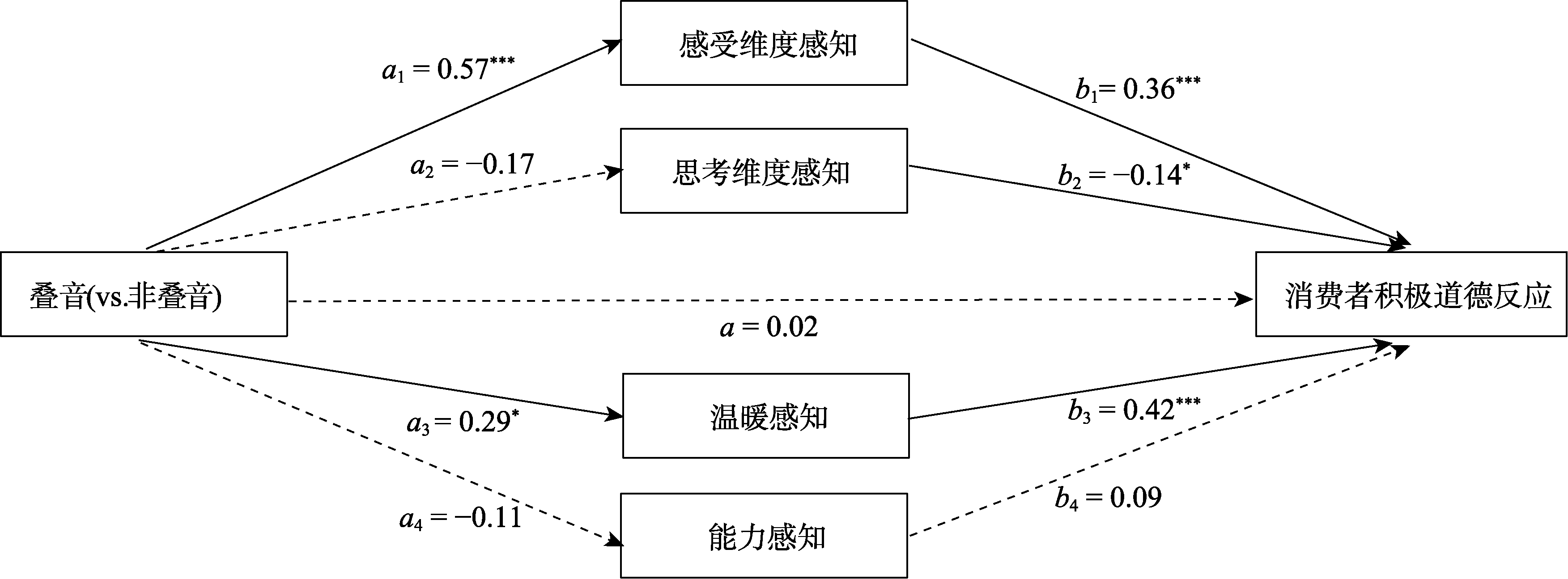 | 图2 道德受害者情况下并行中介效应检验系数路径图 注: * p < 0.05, *** p < 0.001。 |