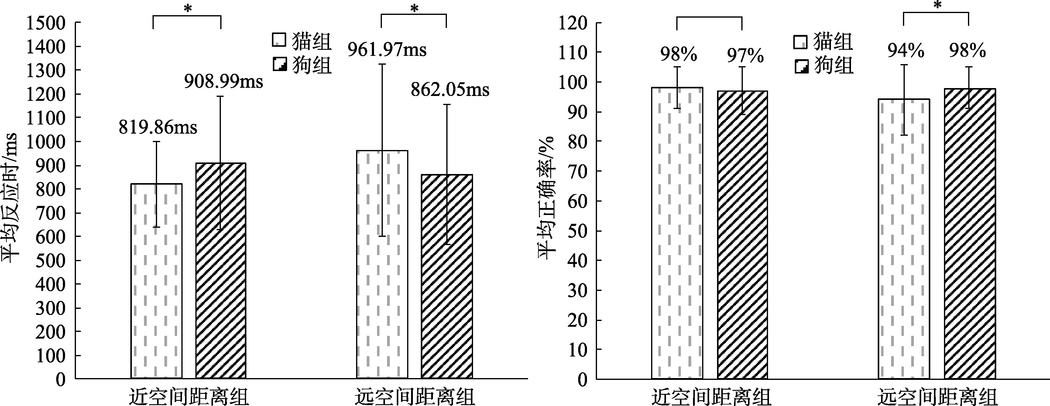 实验1a中动物类型和空间距离对平均反应时和平均正确率的影响图