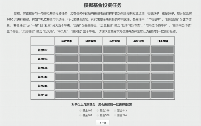 研究2基于日常生活中属性信息不会像决策任务一样得到结构化排列的现状, 在研究1结果基础上开展干预研究, 模拟的互联网基金理财情境, 通过引导被试对信息做结构化整合来干预其加工方式, 探究其决策质量的改善, 以期通过帮助基金新手掌握恰当的信息加工方式改善理财行为。