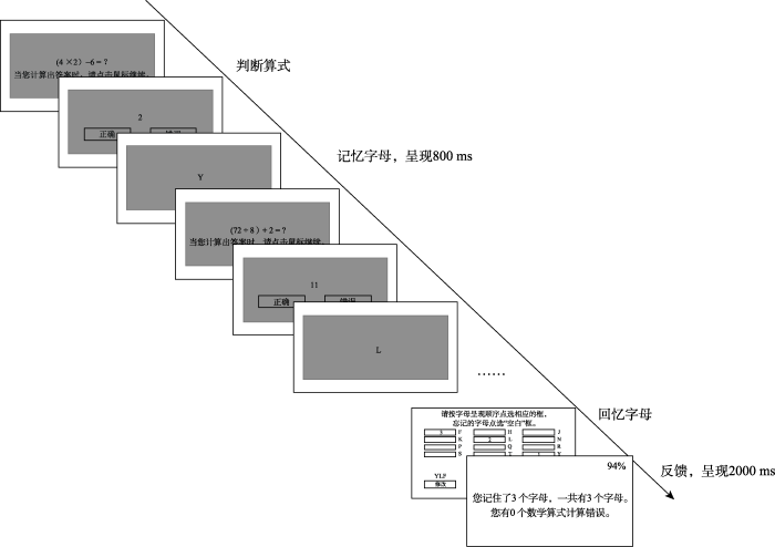 采用Unsworth等(2005)开发的操作广度任务测量工作记忆, 运用MATLAB软件和PsychToolbox-3工具箱在计算机上呈现。梅高兴等人(2021)对该任务进行了中文译制, 信效度良好。被试进行三次练习任务(记忆字母练习、判断算式练习、正式任务练习)后, 开始正式测试, 如图2所示, 屏幕上会先呈现一个算式(如72/8 + 2 = ?), 被试需计算结果并判断下一页给出的数字是否为此算式的正确结果, 被试需尽快给出结论, 若判断超时会自动跳转到下一页, 并认定判断错误(若算式判断上的累计正确率低于85%, 表明被试可能为了记忆字母而不认真完成算式判断, 则被试的工作记忆得分无效; 梅高兴 等, 2021)。算式判断完成后, 屏幕上都会呈现一个字母, 持续800 ms, 随后进入下一个算式判断, 因此每组任务呈现的算式数与字母数相同, 被试需按顺序记忆所有字母, 并在相应页面中依次点选出字母。正式测试会呈现15组任务, 每组任务的字母数3到7个不等, 全部测试共含有75个字母, 以回忆正确的字母数量作为被试工作记忆水平的指标。