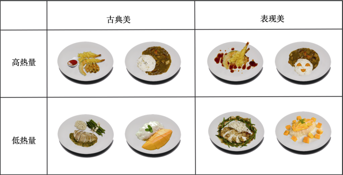 食物是一种属性复杂的刺激对象, 它既为身体机能的正常运转提供能量, 从而具有功利属性; 也提供美味体验、感官享乐等额外奖赏价值, 从而被赋予享乐属性。那么在食物的摆盘视觉设计中, 人们会更偏好古典美还是表现美?换言之, 在美感相同的前提下, 哪种审美设计特征能够最大化食物的审美价值, 进而调节热量对食物选择的影响?在不改变视觉美感的前提下, 辨别不同审美特征诱发的食欲价值是重要的。因为对于餐饮行业而言, 虽然提高健康食物的视觉美感来提升其饮食体验是常用的健康饮食助推方式(Cadario & Chandon, 2020; Cornil & Chandon, 2016), 但很少有餐厅使用低视觉美感呈现不健康食物来达到减少消费者不健康食物选择率的目的。由于视觉美感往往影响产品质量感知(Pombo & Velasco, 2021), 低美感的食物呈现方式可能会对餐饮企业的品牌形象造成威胁(Jin et al., 2015)。然而, 通过鉴别相同美感、不同审美价值的摆盘审美特征设计将有助于在不影响品牌形象和食物质量感知的前提下, 为餐饮商提供助推消费者健康食物选择的两种并行路径——将健康食物以高食欲价值的审美特征摆盘, 同时将不健康食物以低食欲价值的审美特征摆盘。