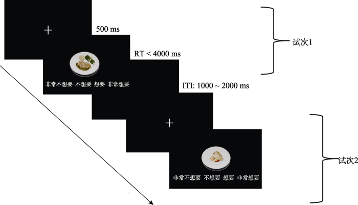 在实验开始前, 被试被告知自己需要对屏幕上出现的食物图片进行想要和不想要的评价, 且反应必须迅速准确。每张食物图片重复呈现3次, 共216个试次, 连续试次中图片呈现顺序随机。对于每个试次, 首先出现500 ms的注视点, 接着屏幕中央呈现食物图片, 被试通过按键(d, f, j, k)来表明他们对该食物的选择偏好(非常不想要, 不想要, 想要, 非常想要), 按键顺序在被试间平衡。这种评级方式能够区分被试是否愿意选择食物(是/否)以及选择偏好的强度(强/弱)。被试做出反应后(或在4 s内没有做出反应)呈现空屏1~2 s, 随即进入下一个试次。试次内流程见图2。整个实验分为15个block, 每个block包含15个试次, 最后一个block内包含6个试次。被试每完成一个block均可休息一段时间。在正式实验开始前, 被试完成了6个练习试次以了解实验要求并熟悉按键位置。