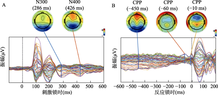 所有试次、所有被试(n = 31)的刺激锁时(A)与反应锁时(B)的广义平均波形。线条颜色代表不同电极点, 峰值活动时间点的头皮拓扑图绘制在波形图上方。彩图见电子版, 下同