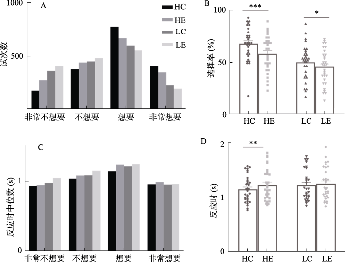 A)不同条件下不同食物选择模式的总试次分布; B)不同条件下食物选择率均值; C)不同条件下不同食物选择模式所对应的反应时中位数; D)不同条件下的反应时均值。注:误差棒为SE, ***为p < 0.001, **为p < 0.01, *为p < 0.05