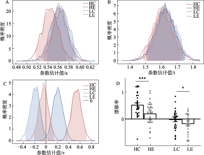 决策参数估计的后验分布A) 决策阈值a; B) 非决策时间t; C) 漂移率v; D) 不同条件下漂移率v的平均数和数据分布, 误差棒反映标准误SE。