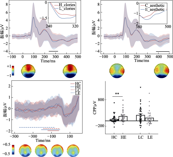 当前研究主要关注三个ERP成分:N300、N400与CPP。鉴于审美经验通常涉及从环境中提取意义(Bara et al., 2022), 本研究在语义认知框架内探讨饮食决策中审美意义的积累。以往研究表明, N400成分对包含物体感知在内的语言与非语言刺激的违规效应敏感(Lauer et al., 2021)。例如, 当食物真实味觉与视觉呈现所诱发的味觉预期不一致(vs.一致)时, 会导致显著更高的负性偏转N400 (Domracheva & Kulikova, 2020), 验证了N400在表征食物的跨通道概念信息方面的潜力; 此外, 在对其它意义刺激的识别任务中, 当先前重复暴露使当前刺激的语义处理更容易时, N400振幅更低, 表明N400对概念加工流畅性敏感(Voss & Paller, 2006, 2007)。因此, N400与意义加工、概念表征以及基于上下文的信息检索有关, 并能通过加工流畅性调制振幅高低。N300在功能意义上部分与N400重合, 是与语义期望和识别过程相关的较早期负性偏转, 并对有意义刺激的识别难度敏感(Lauer et al., 2018)。最新一项研究表明, N300和N400可能反映了相同皮层基底所映射的连续过程上不同的认知计算时段(Draschkow et al., 2018)。根据以往研究, 物体识别 N300以及意义处理与整合N400具有较多的枕叶分布(Huang et al., 2010; Kutas & Federmeier, 2011; Truman & Mudrik, 2018)。因此, 在现有文献基础上, 根据广义平均波形图和全脑地形图分布, 在刺激呈现后枕叶电极团(PO3、PO4、POz、O1、O2、Oz) 380~500 ms间提取N400平均振幅。此外, 在相同脑区较早时间窗(240~320 ms)提取N300的平均振幅进行分析。N300/N400全导联包络图见图3A。