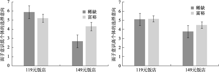 对于面子意识低的个体来说, 稀缺与饭店类型的交互作用显著, F(1, 79) = 15.37, p < 0.01, 偏η² = 0.16。具体来看, 对于面子意识低的个体来说, 稀缺组被试选择119元饭店的意向(M = 5.88, SD = 1.47)边缘显著高于富裕组被试(M = 5.26, SD = 1.61), t(79) = 1.95, p = 0.05, 但是在149元饭店上, 稀缺组被试的选择意向(M = 2.69, SD = 1.48)的意向显著低于富裕组被试(M = 4.31, SD = 1.75), t(79) = −4.66, p < 0.01 (见图2左)。