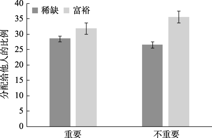 稀缺与面子重要性同样具有显著的交互作用, F(1, 181) = 4.38, p < 0.05, 偏η² = 0.07。简单效应分析结果显示, 对于面子不重要的个体来说, 稀缺组被试分配给他人的比例(M = 35.41, SD = 15.11)显著低于充裕组被试(M = 49.70, SD = 18.66), t(92) = −4.07, p < 0.01, Cohen’d = −0.38 ; 而对于面子重要的个体来说, 稀缺组被试分配给他人的比例(M = 40.25, SD = 16.89)与充裕组被试(M = 43.24, SD = 13.95)无显著差异, t(94) = −0.94, p = 0.35。具体见图3。