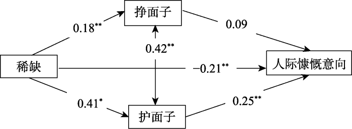 假设2: 护面子在物质稀缺与慷慨行为之间起中介作用。