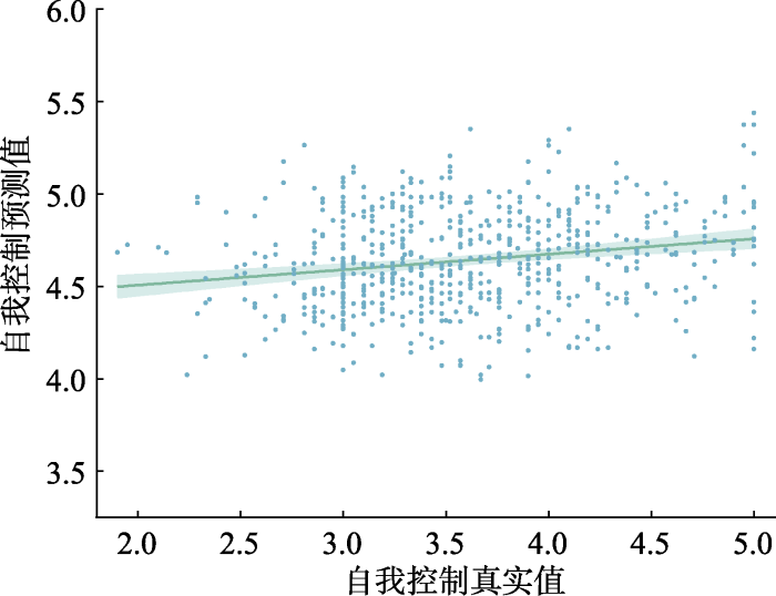 采用Python 3.7软件进行留一法交叉验证(leave-one-out cross-validation)筛选关键基因多态性位点, 计算多基因累加分数(Yu et al., 2022)。具体而言, 留一法交叉验证将被试划分为训练集(N−1个被试)和测试集(1个被试), 多次迭代地进行训练和测试来提高结果的可靠性。具体步骤: (1)筛选关键基因多态性位点: 在训练集中将候选SNP与父母情感温暖构建交互项, 对交互项和自我控制分数做回归分析, 若回归系数显著(95%迭代次数), 则将该SNP标志为关键基因多态性位点并纳入后续分析; (2)计算多基因累加分数: 将交互项的回归系数显著且小于0的关键SNPs的基因型反向计分, 对所有关键SNPs的基因型进行累积并计算均值; (3)模型训练: 在N − 1个被试的训练集中, 把标准化的父母情感温暖分数、标准化的多基因累加分数以及两者的交互项与自我控制分数做回归分析, 通过留一法选择R2最大的回归方程式; (4)模型预测: 将测试集的多基因累加分数和父母情感温暖带入步骤(3)的最佳回归方程式, 得出相应的自我控制预测分数。经过N次迭代, 生成所有被试的自我控制预测分数。将模型预测的自我控制分数与真实的自我控制分数进行相关分析, 以检验上述模型的预测能力。