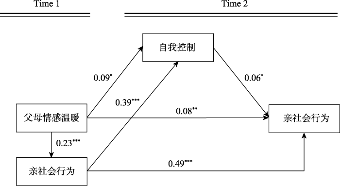 假设1: 父母情感温暖通过提高青少年的自我控制, 进而显著正向预测亲社会行为;